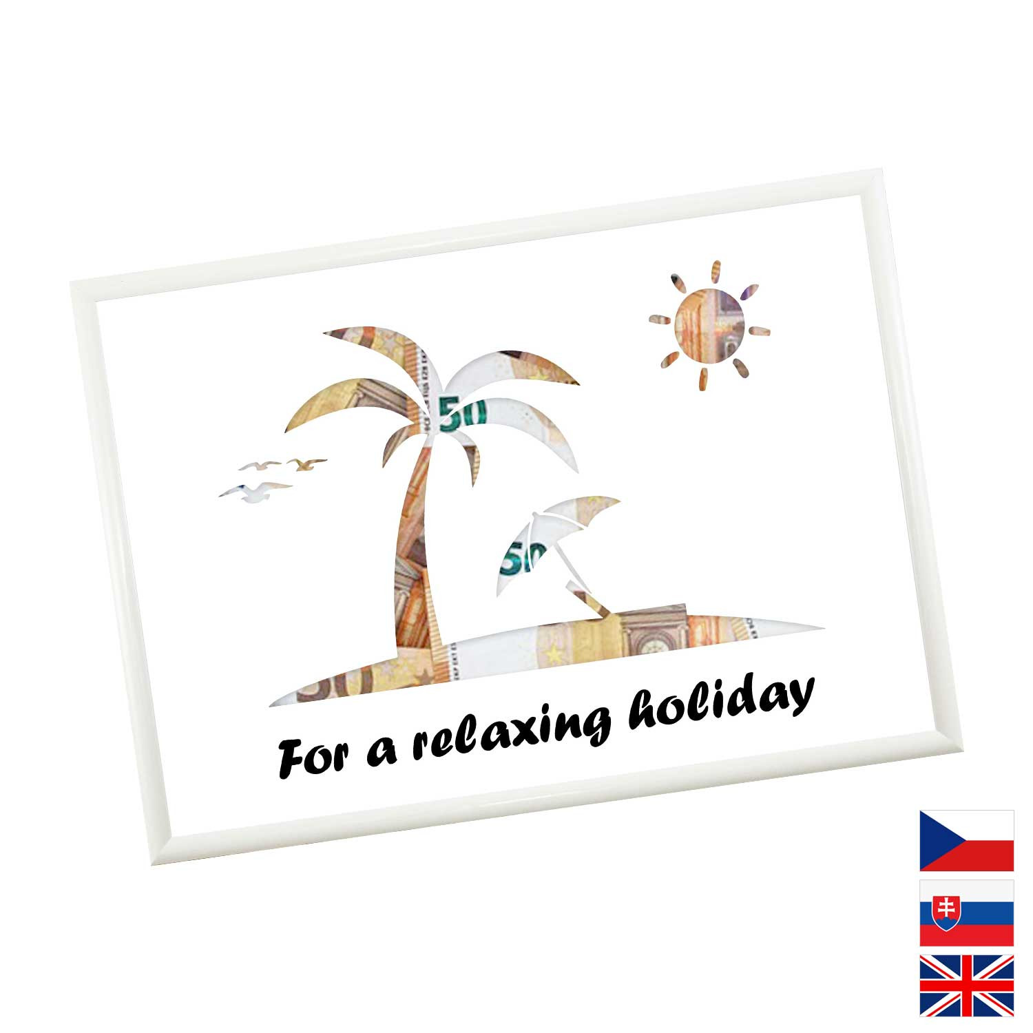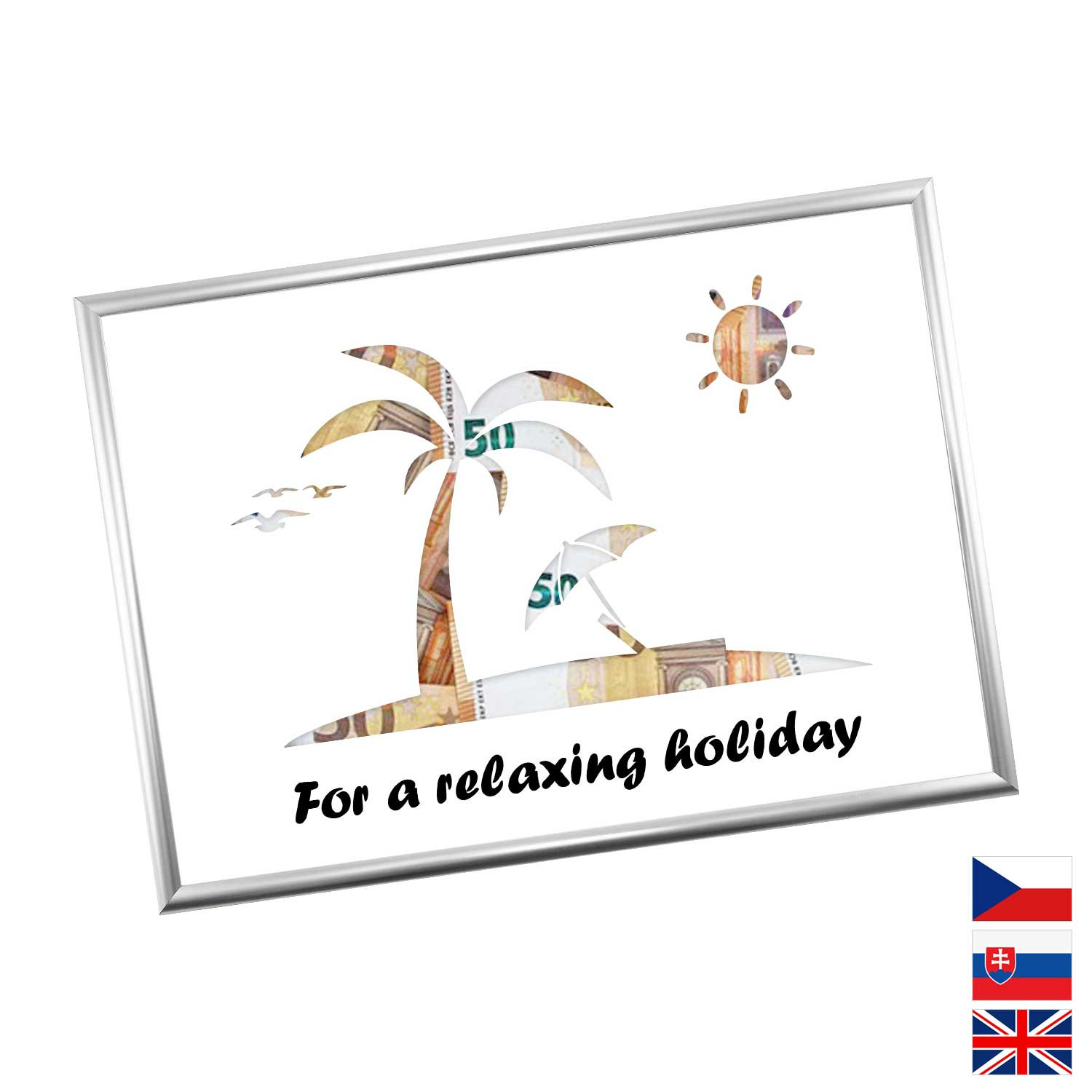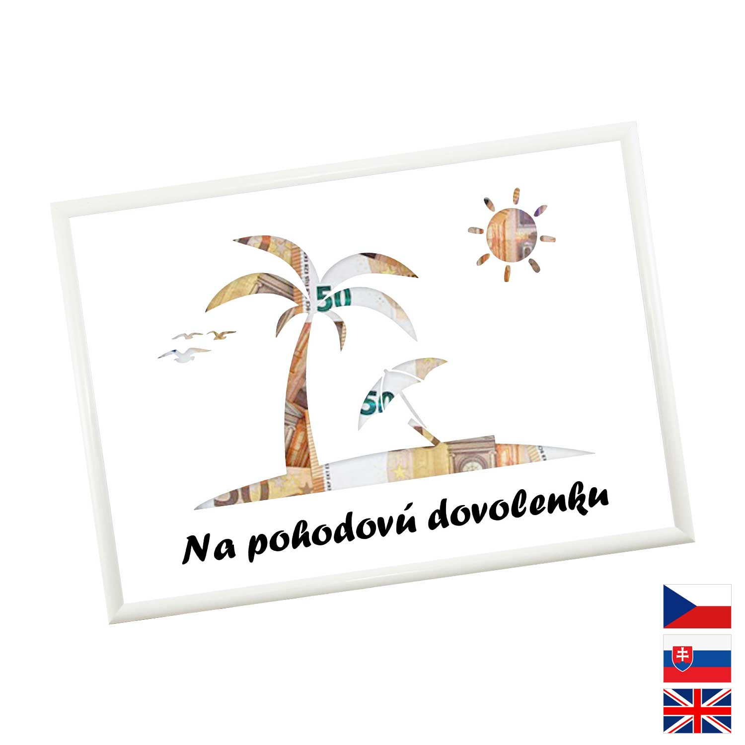 Originální způsob darování peněz pro všechny milovníky letních dovolených a výletních lodí. Pokud si marně lámete hlavu, jaký dárek pořídit, pak finanční obnos je ideální volba. Rámeček o velikosti A4 obsahuje karton s výřezy na bankovky. Rámeček můžete později použít na fotky.