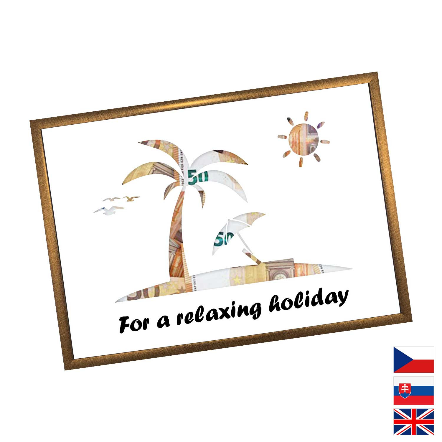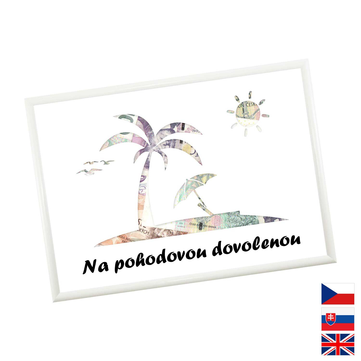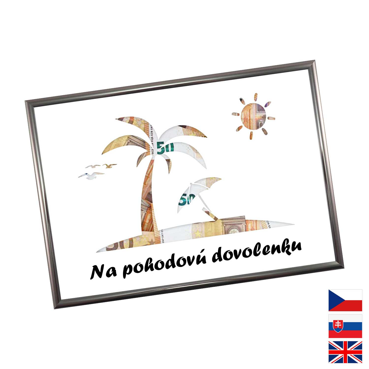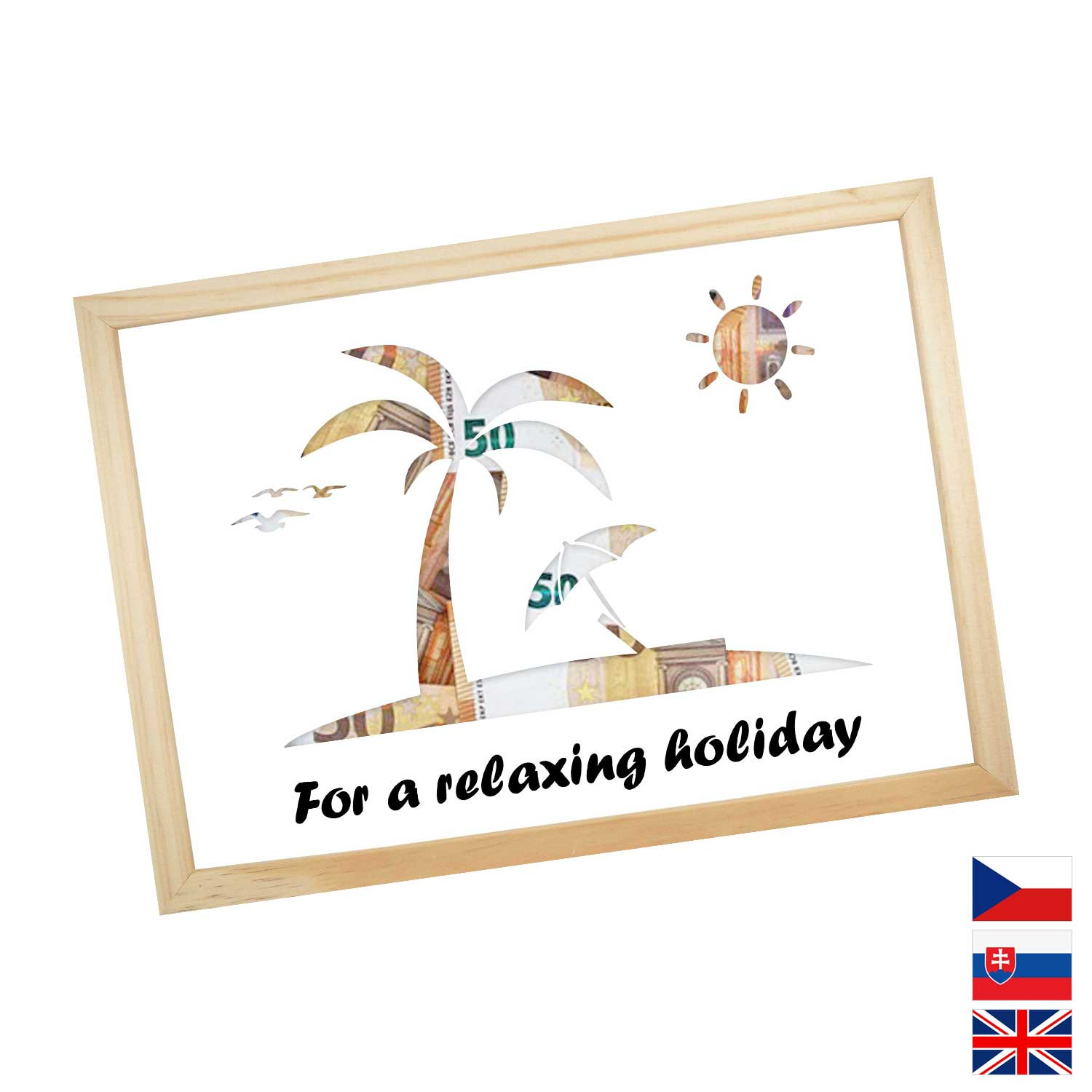 Originální způsob darování peněz pro všechny milovníky letních dovolených a výletních lodí. Pokud si marně lámete hlavu, jaký dárek pořídit, pak finanční obnos je ideální volba. Rámeček o velikosti A4 obsahuje karton s výřezy na bankovky. Rámeček můžete později použít na fotky.