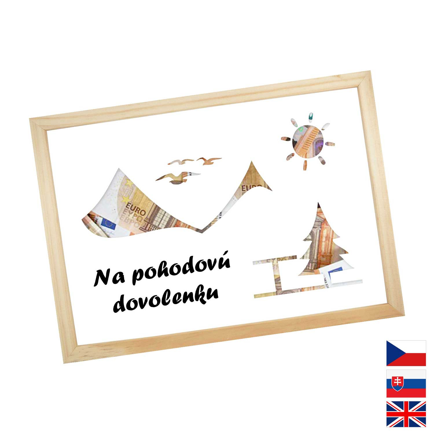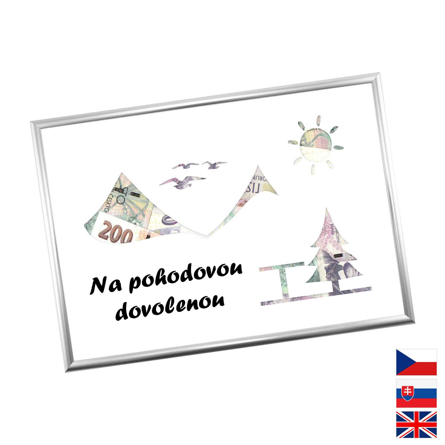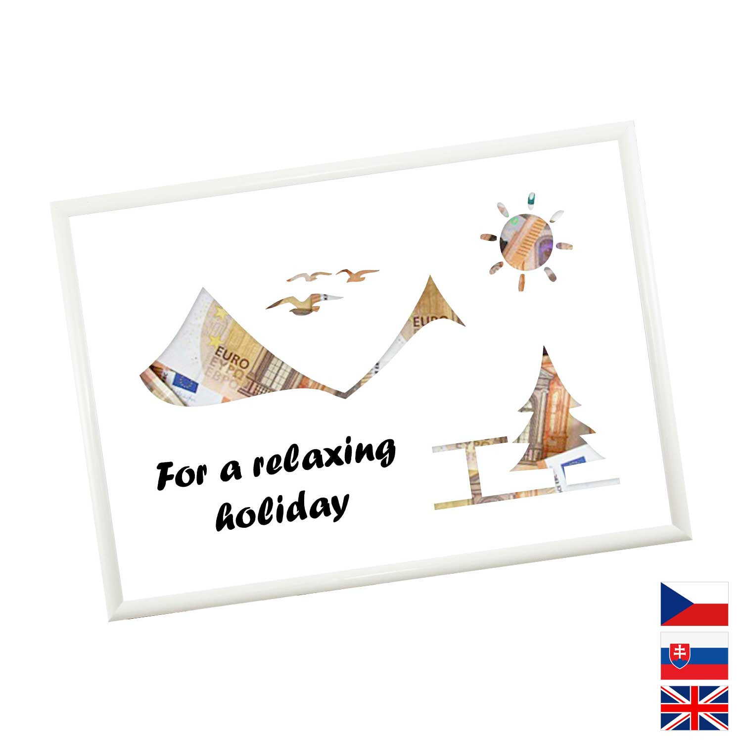Originálny spôsob darovanie peňazí pre všetkých milovníkov letných dovoleniek a výletných lodí. Pokiaľ si márne lámete hlavu, aký darček zaobstarať, potom finančný obnos je ideálna voľba. Rámček o veľkosti A4 obsahuje kartón s výrezmi na bankovky. Rámček môžete neskôr použiť na fotky.