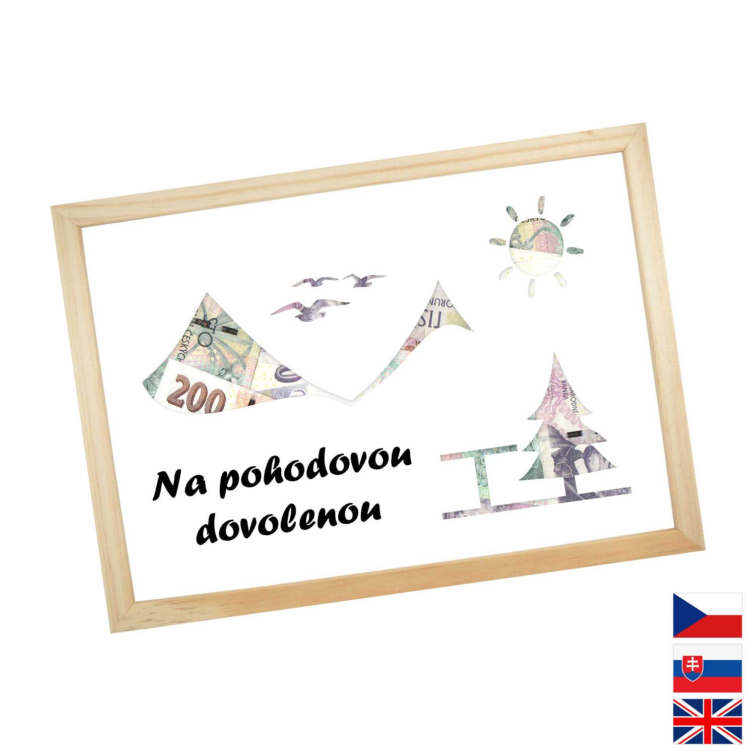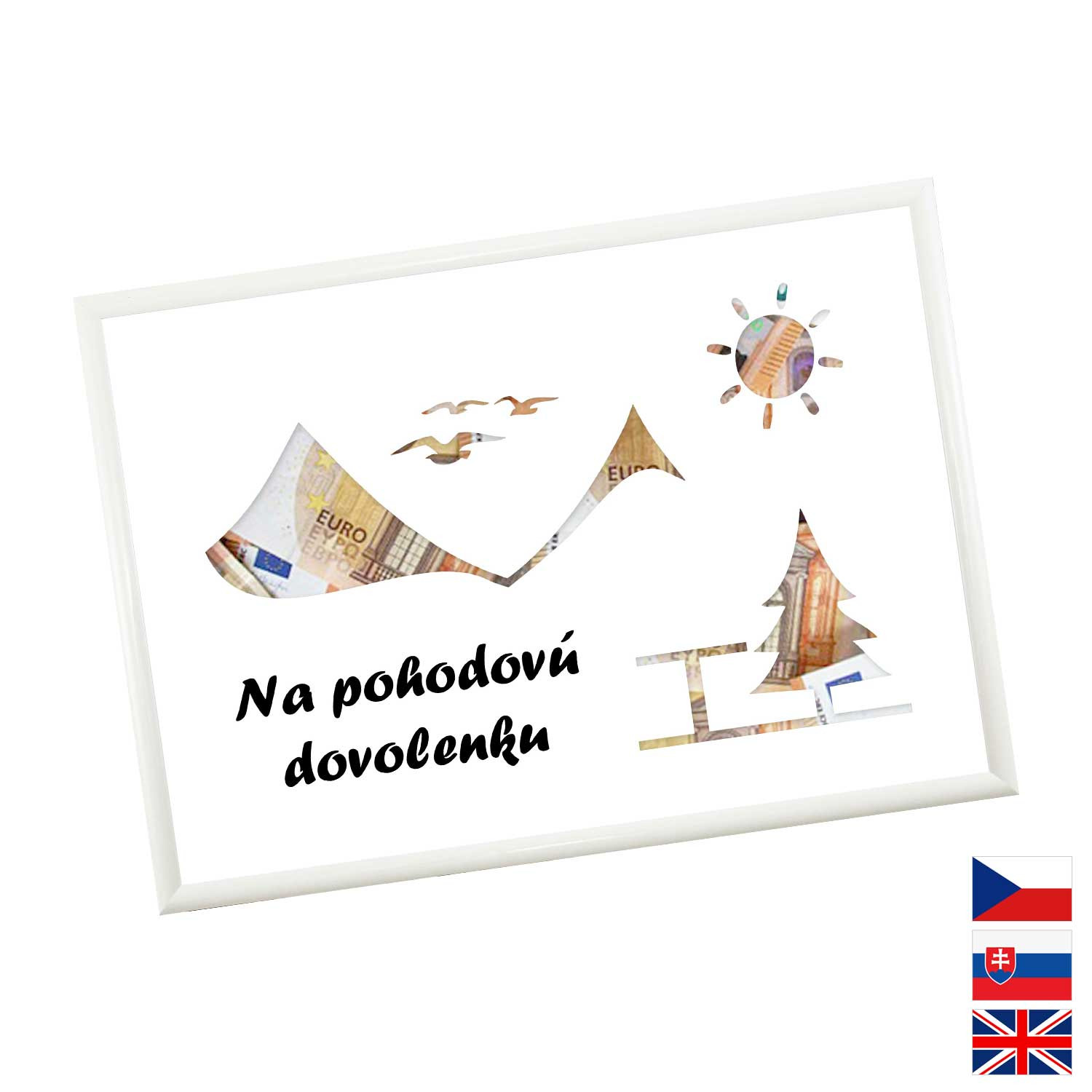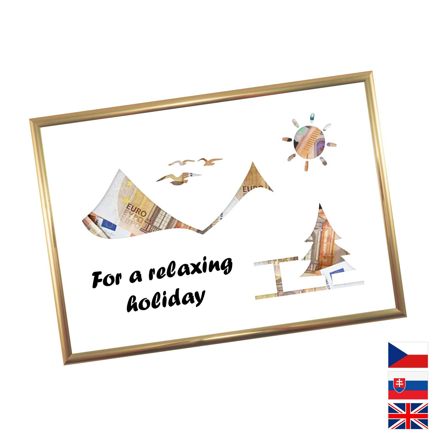 Originálny spôsob darovanie peňazí pre všetkých milovníkov letných dovoleniek a výletných lodí. Pokiaľ si márne lámete hlavu, aký darček zaobstarať, potom finančný obnos je ideálna voľba. Rámček o veľkosti A4 obsahuje kartón s výrezmi na bankovky. Rámček môžete neskôr použiť na fotky.