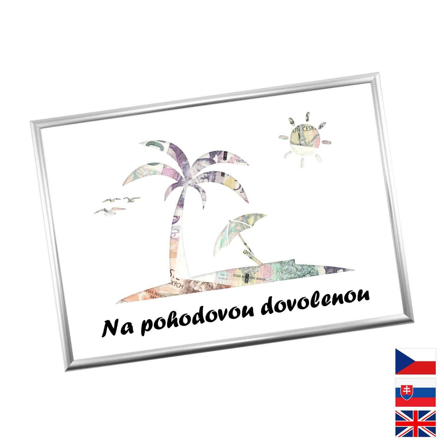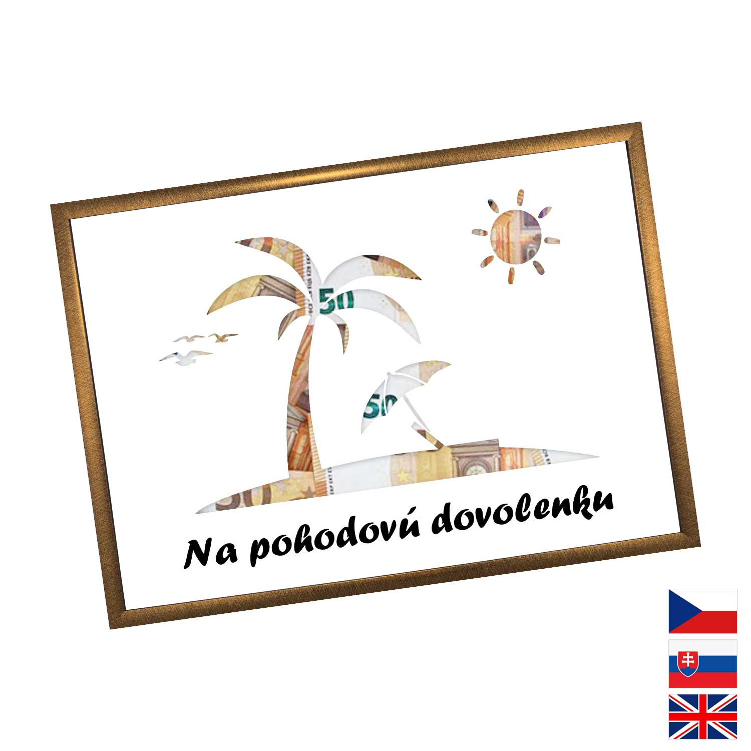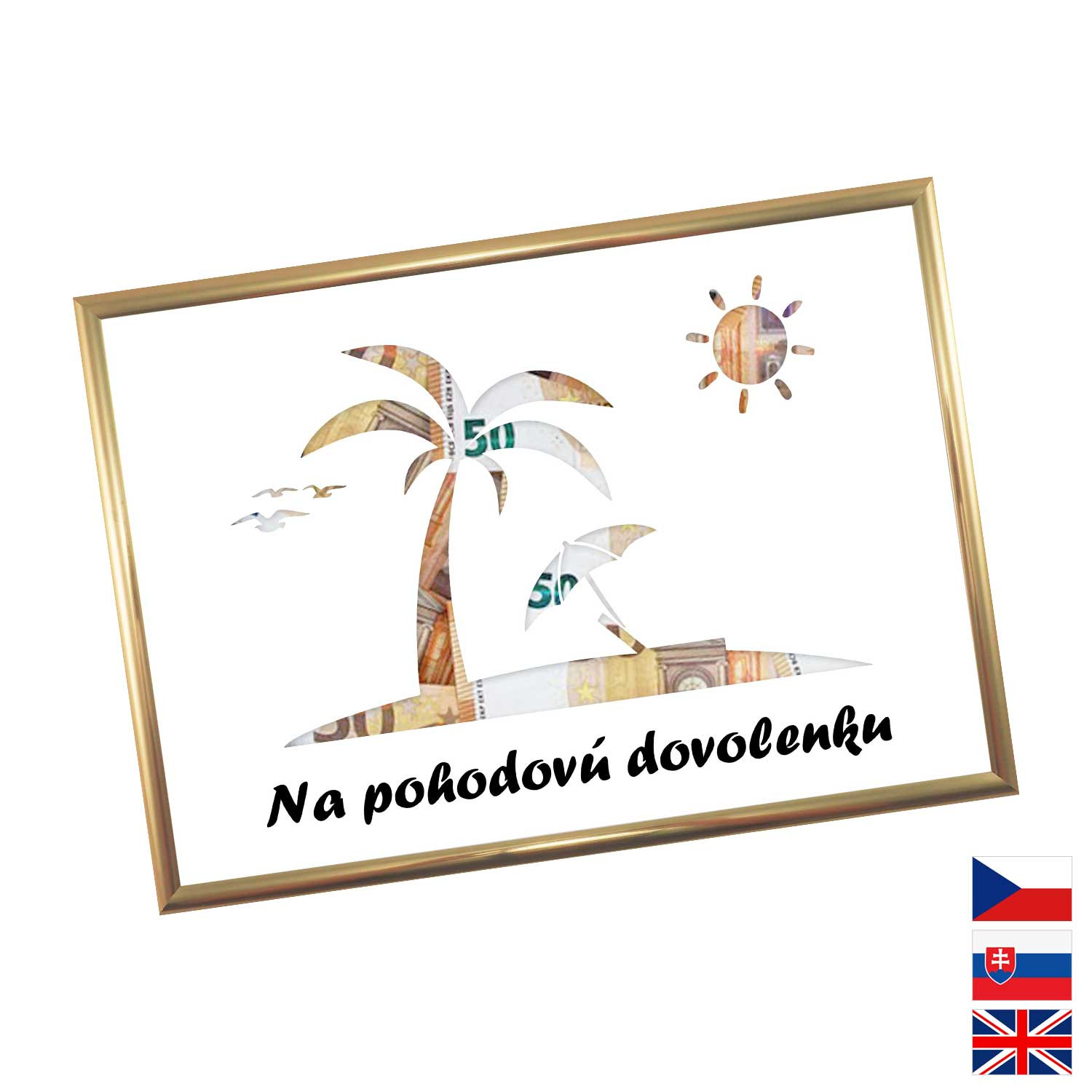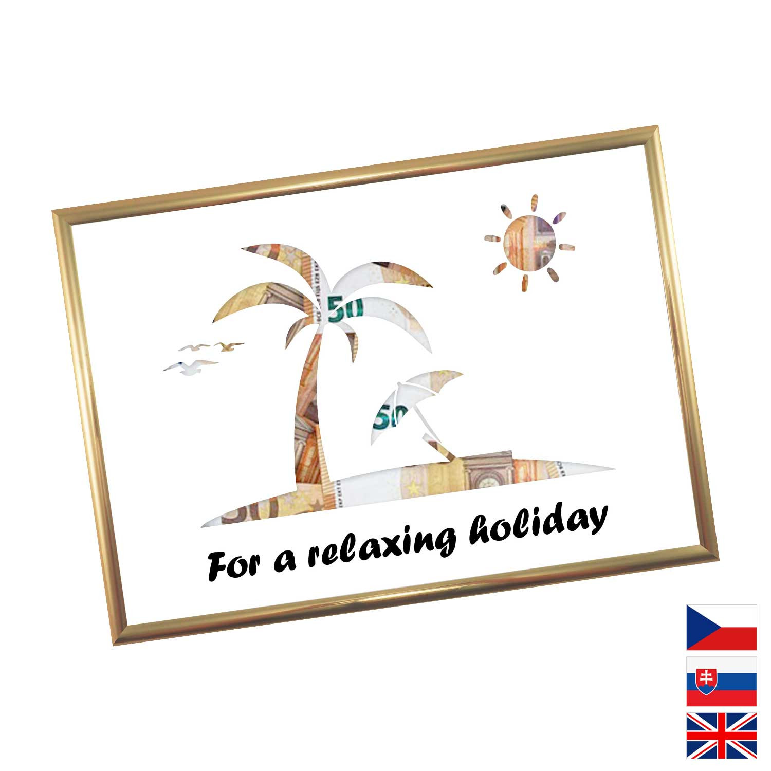 Originálny spôsob darovanie peňazí pre všetkých milovníkov letných dovoleniek a výletných lodí. Pokiaľ si márne lámete hlavu, aký darček zaobstarať, potom finančný obnos je ideálna voľba. Rámček o veľkosti A4 obsahuje kartón s výrezmi na bankovky. Rámček môžete neskôr použiť na fotky.